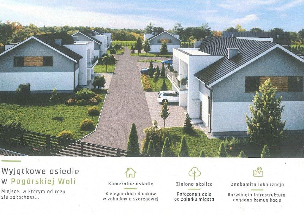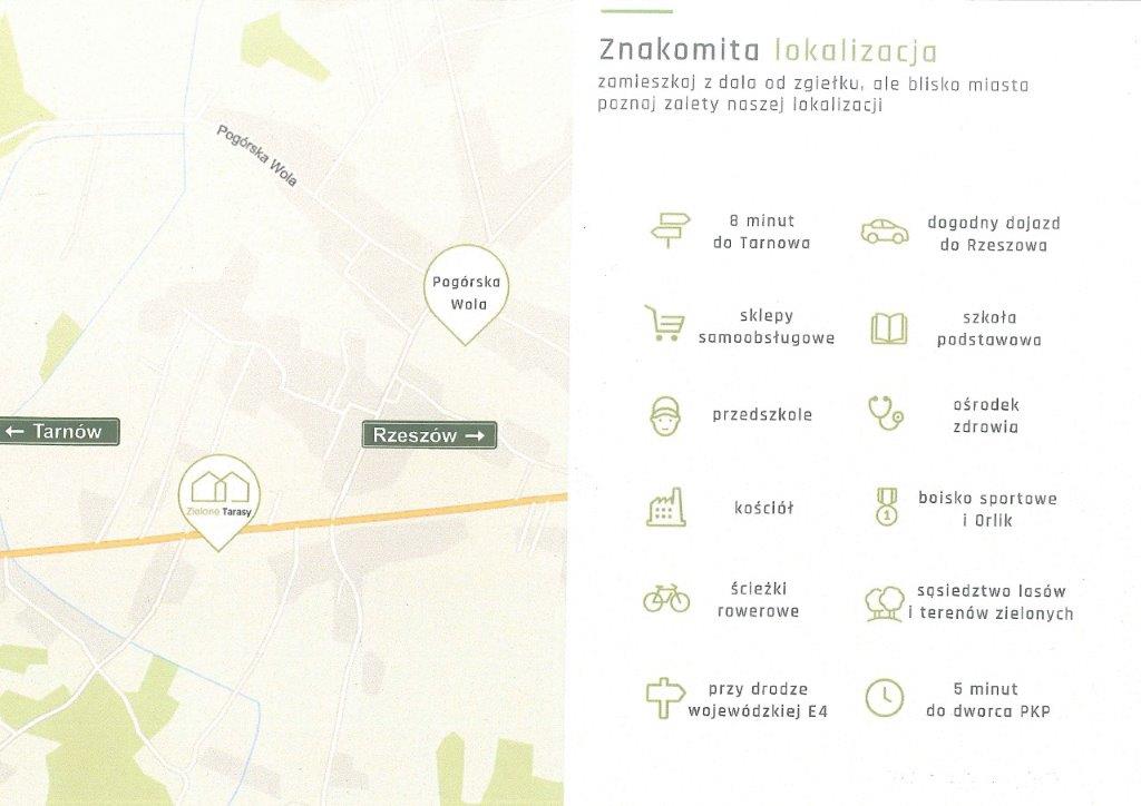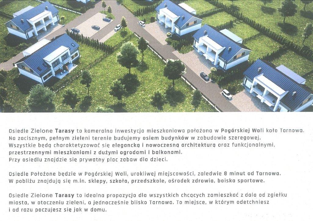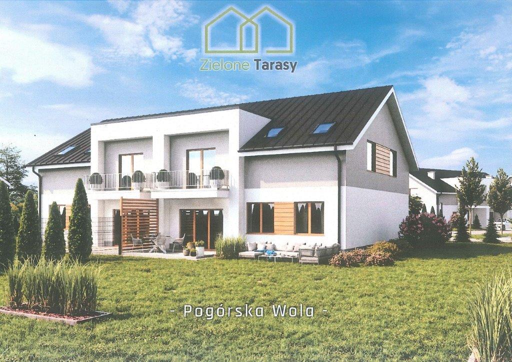Kompleks 8 budynków z apartamentami w Pogórskiej Woli , na nowo powstałym osiedlu ZIELONE TARASY. Dojazd drogą asfaltowa, wszystkie media w budynkach. Możliwość uzgodnienia rozplanowania pomieszczeń . Powierzchnia jednego apartamentu około 89 metrów kwadratowych na parterze i 86 metrów kwadratowych na piętrze. Pomieszczenia na parterze można połączyć z pomieszczeniami na piętrze jako całość. Budynek w stanie deweloperskim. do każdego lokalu mieszkalnego przynależy część gruntu przeznaczona do zagospodarowania przez właścicieli mieszkań. Wielkość ogródków zależ od ilości wykupionych segmentów w budynku. Miejsce postojowe pod budynkiem lub na wewnętrznym parkingu. W planach na osiedlu ma powstać plac zabaw dla dzieci. Całość będzie ogrodzona z elementami zagospodarowanej zieleni wspólnej. Z Zielonymi Tarasami bezpośrednio sąsiadują las, zabudowa jednorodzinna i drogi dojazdowe. W bliskiej odległości kościół , szkoła , sklepy, przedszkole, ośrodek zdrowia, - centrum Pogórskiej Woli. W okolicy ścieżki rowerowe, boisko sportowe Orlik, sąsiedztwo lasów. Dogodny dojazd do Tarnowa i Rzeszowa, bliski dojazd do drogi krajowej E 4, 5 minut do dworca PKP, 8 minut do Tarnowa. CENA za metr kwadratowy : 3600 zł w stanie deweloperskim. W cenę nie jest wliczony grunt przeznaczony na prywatne ogrody przylegające do lokali.